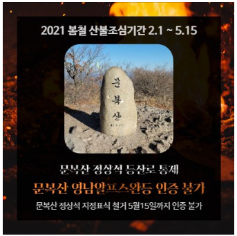 ✔ 산불조심기간 동안 문복산, 운문산 등 등산로가 전면 통제된 곳은 이용 자제 부탁드리며, "문복산" 인증을 5월 15일 이후에 해주실 것을 당부 드립니다.(2.1.~5.15. 문복산 인증은 입산허가증 증빙 필요)